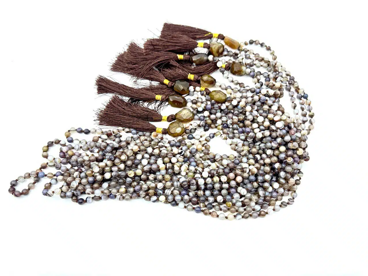 Welcome to our exquisite collection featuring the Botswana Agate Jap Mala Necklace. Discover the harmonious fusion of natural beauty and spiritual resonance in this meticulously crafted masterpiece.