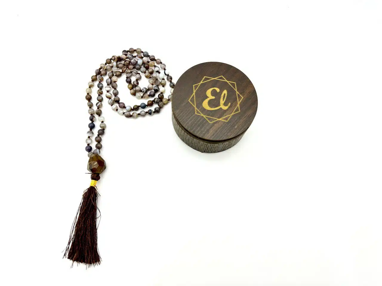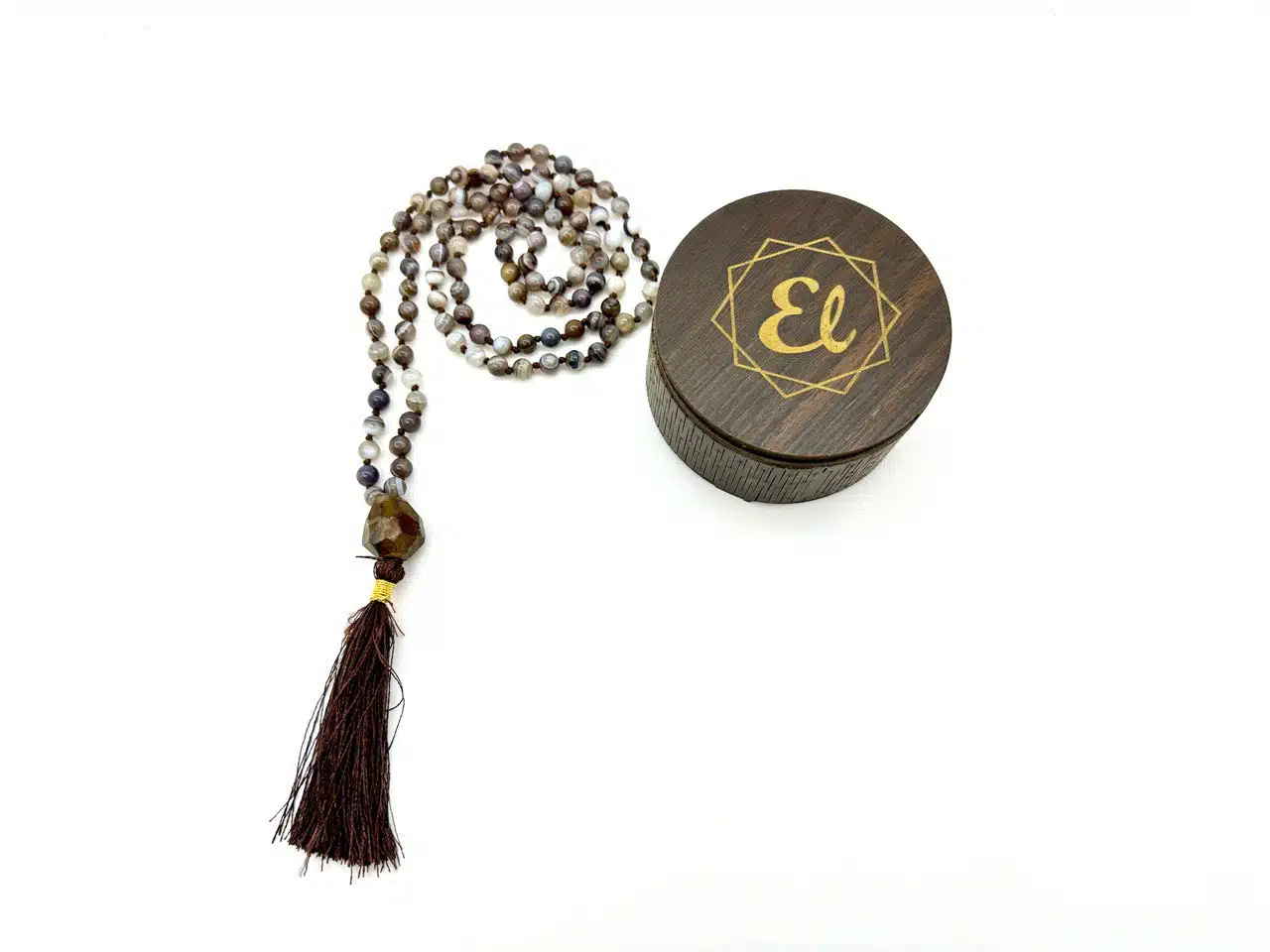 The Botswana Agate Jap Mala  Necklace encapsulates these benefits within a beautifully crafted accessory, allowing you to carry its positive energies with you wherever you go. Whether you’re drawn to its aesthetic appeal or its spiritual significance, this necklace is a valuable addition to your holistic well-being journey.